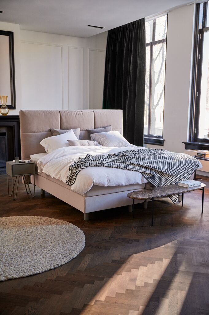 De Auping Kiruna Boxspring Unik biedt een strakke, rustige uitstraling die een moderne slaapkamer elegant aanvult. Dankzij het minimalistische design met heldere lijnen oogt het bed ruimtelijk en rustig. De luxe paardenhaar topper is subtiel verwerkt en geeft het geheel een verfijnde, natuurlijke textuur zonder overdreven te zijn. Het bed straalt kwaliteit uit door de nette afwerking en de aandacht voor detail, waardoor het een tijdloos en verzorgde indruk maakt in elke slaapkamer.