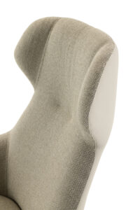 Deze draaifauteuil heeft een hoge rugleuning met elegante ‘oortjes’ en is opvallend laag aan de grond. De zitting is vast gestoffeerd—zonder los kussen—waardoor de stoel strak en modern oogt. De binnen- en buitenzijde zijn apart te bekleden voor extra design‐impact.