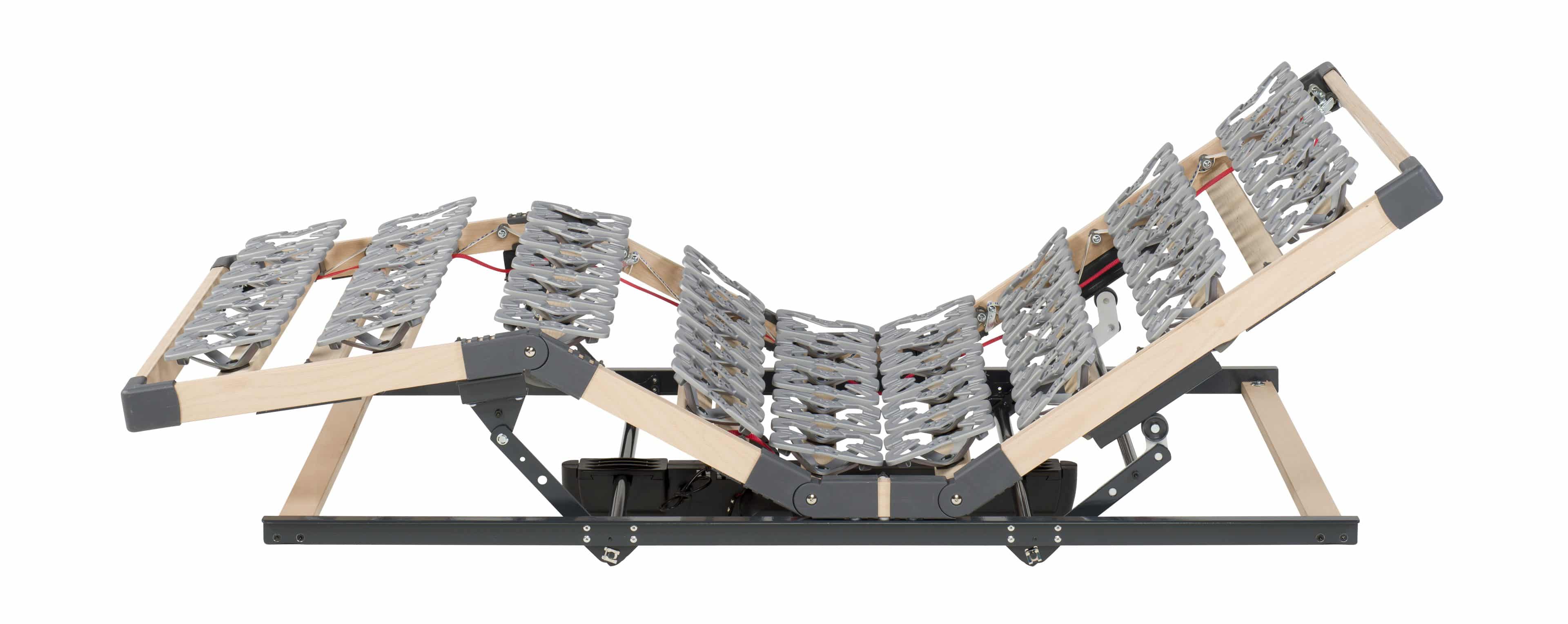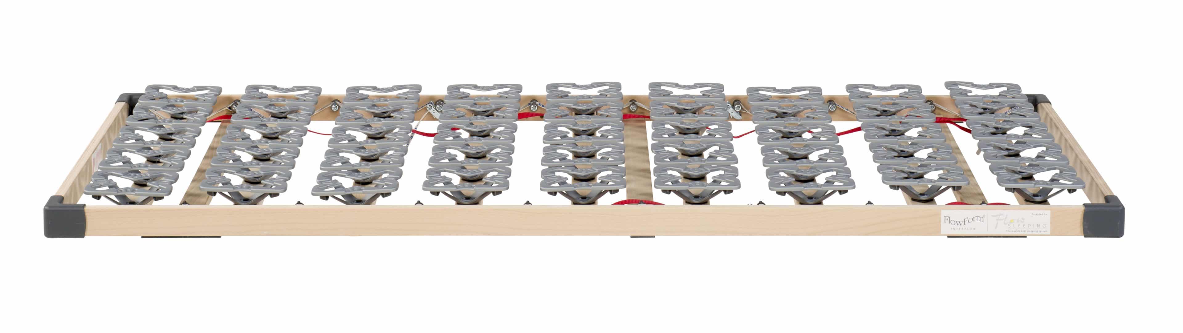 De Interflow bodem van het merk Flowsleeping is een uniek door zijn ingenieus raamwerk. In dat raamwerk zijn aan de lange binnenzijden banden gemonteerd, die over steunpunten rollen. Elke zijde heeft drie bevestigde banden welke afzonderlijk van elkaar instelbaar zijn. Deze banden ondersteunen respectievelijk de schouders, het bekken en de benen.Bij de FlowForm rust op deze banden een vrij bewegende bodem met schotels bestaande uit negen elementen. Elke FlowForm is zelfregulerend in z’n ondersteuning en past zich dus automatisch aan elke houding aan.